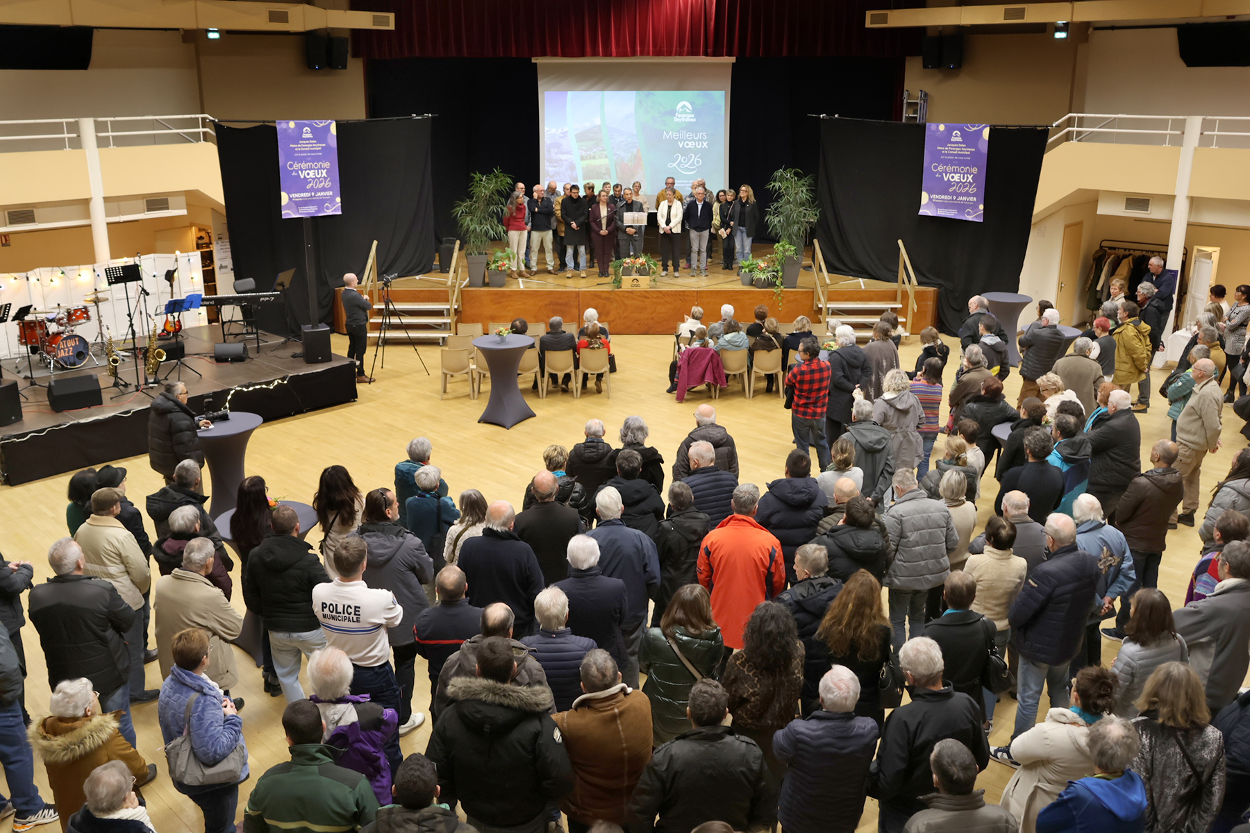 L’accueil des convives s’est fait en musique, avec la participation très appréciée du groupe « Atout jazz ». Le Maire de Faverges-Seythenex a invité les élus du conseil autour de lui et commencé son intervention par une minute de silence en mémoire des victimes de l’incendie de Crans-Montana. Après cet hommage, il a rappelé le contexte international, marqué par les incertitudes géopolitiques et économiques. Il a ensuite développé l’importance du rôle des collectivités locales, les communes en tête, qui constituent le premier échelon de proximité, repère stable et rassurant, où l’action publique s’exerce en continuité et dans l’intérêt général.
